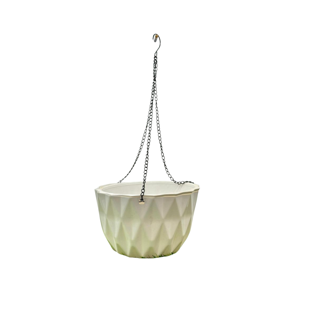 Made from high-quality, weather-resistant plastic, this hanging pot is built to withstand sun exposure, rain, and outdoor conditions, as well as indoor environments. Lightweight and easy to mount, it’s great for both novice and experienced gardeners. Whether you’re growing flowering plants, trailing vines, herbs, or succulents, this White Diamond Cut Hanging Pot adds style and practicality to your plant setup.