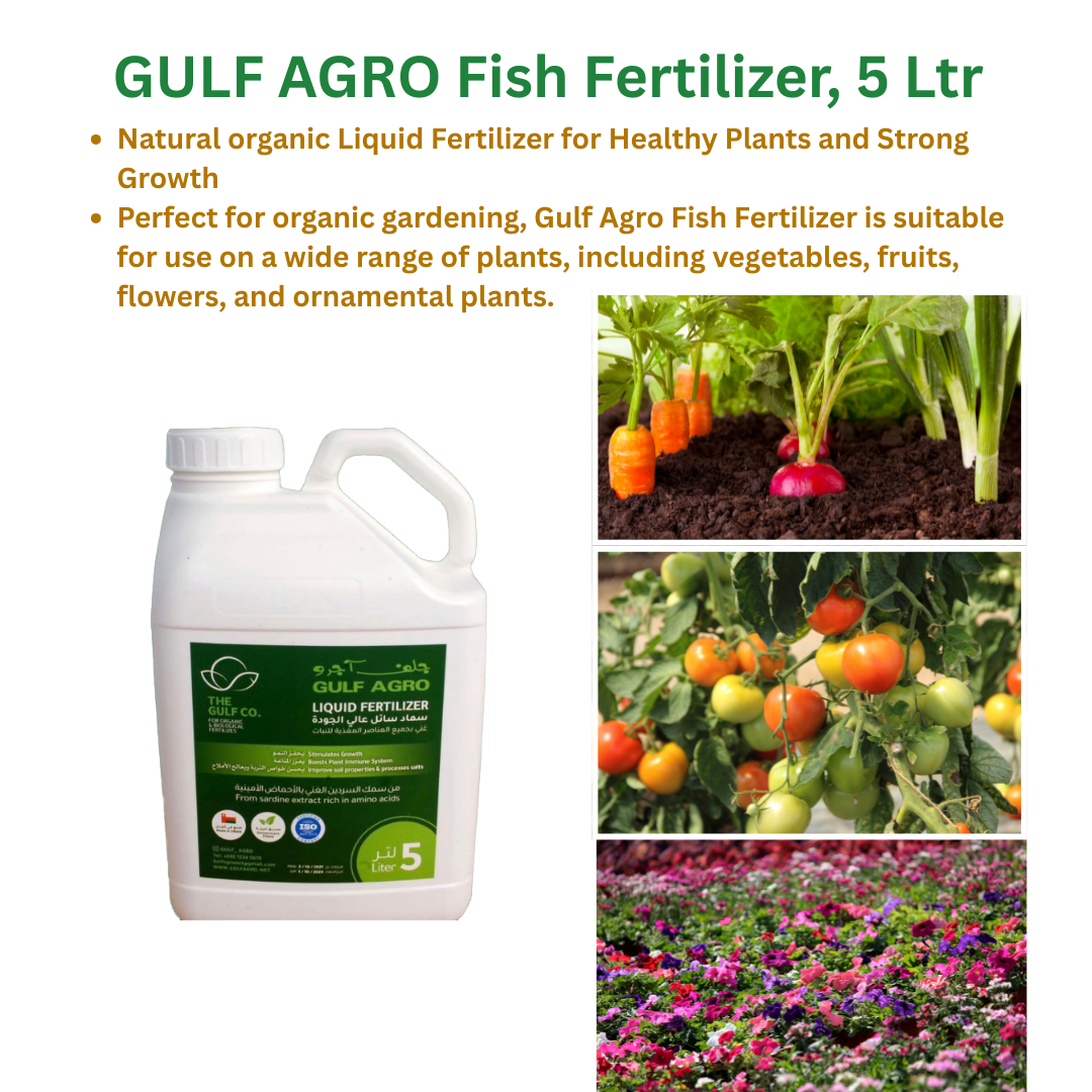 Keywords: Fish fertilizer; Natural liquid fertilizer; Organic plant food; liquid fish fertilizer; Gulf Agro fertilizer, 5-liter fish fertilizer; Liquid fertilizer for plants. Organic garden fertilizer; Fish emulsion fertilizer; Healthy plant growth; Soil enrichment fertilizer; Fish-based plant food; Organic liquid fertilizer supplier UAE; Fertilizer in UAE; Fertilizer order online Dubai;